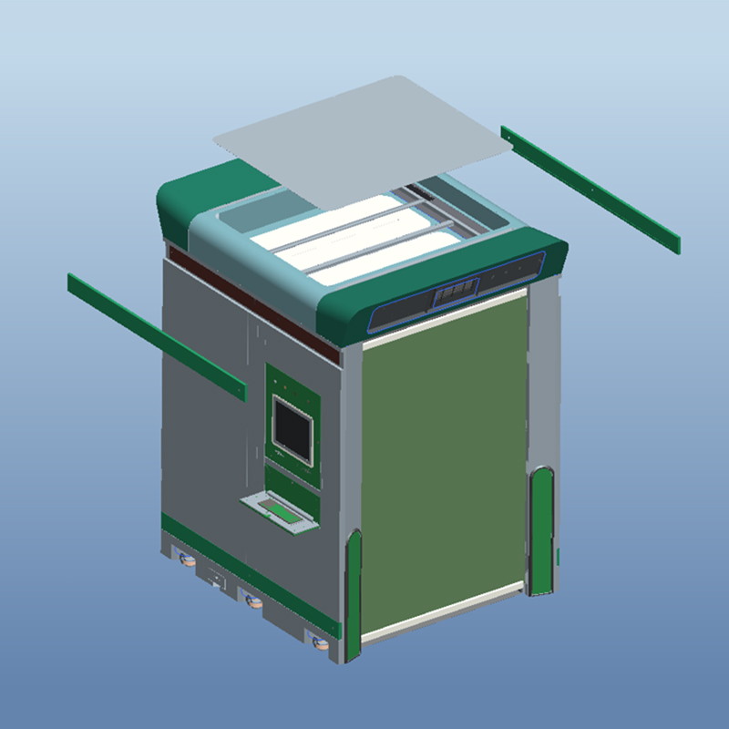 拆除包裝后,將通道機腳輪裝好(使用螺絲型號),左右共6個腳輪。將腳輪打到標準低,直至站立不滑動。將兩側面板站立,再將頂部結構架上安裝槽卡住,座進去。(如圖1.1)